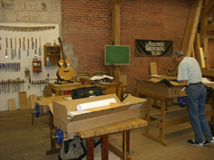 On Saturday, June 16, 2007 at 9:00 AM, I started on a six-month journey to build a steel string guitar. I completed the guitar on December 21. I started the next guitar on January 12th, 2008. I enrolled in the Spring of 2007 in a class held at Gary Rogowski's Northwest Woodworking Studio in Portland. My wife, Carol, and I travelled on Friday up from Corvallis (100 miles south) and stayed the evening and that weekend so that I could attend the class. Carol attended a class in cooking at the Oregon Culinary Institute, which she loved. The class met on three weekends during the summer--one weekend in the middle of each month of June, July, and August. A new class, formed for the summer of 2008, now is structured as six weekends. I think this will make the class better by providing more instruction between in-studio sessions. The instructor was Dan Biasca (that's him to the right above, demonstrating how to bend the guitar sides), who is teaching this class of six students how to make a steel string guitar. The guitar we built? The small jumbo steel string guitar shown on the photo to the right that Dan brought to and played for us on that first Saturday. Our workbenches are ready...